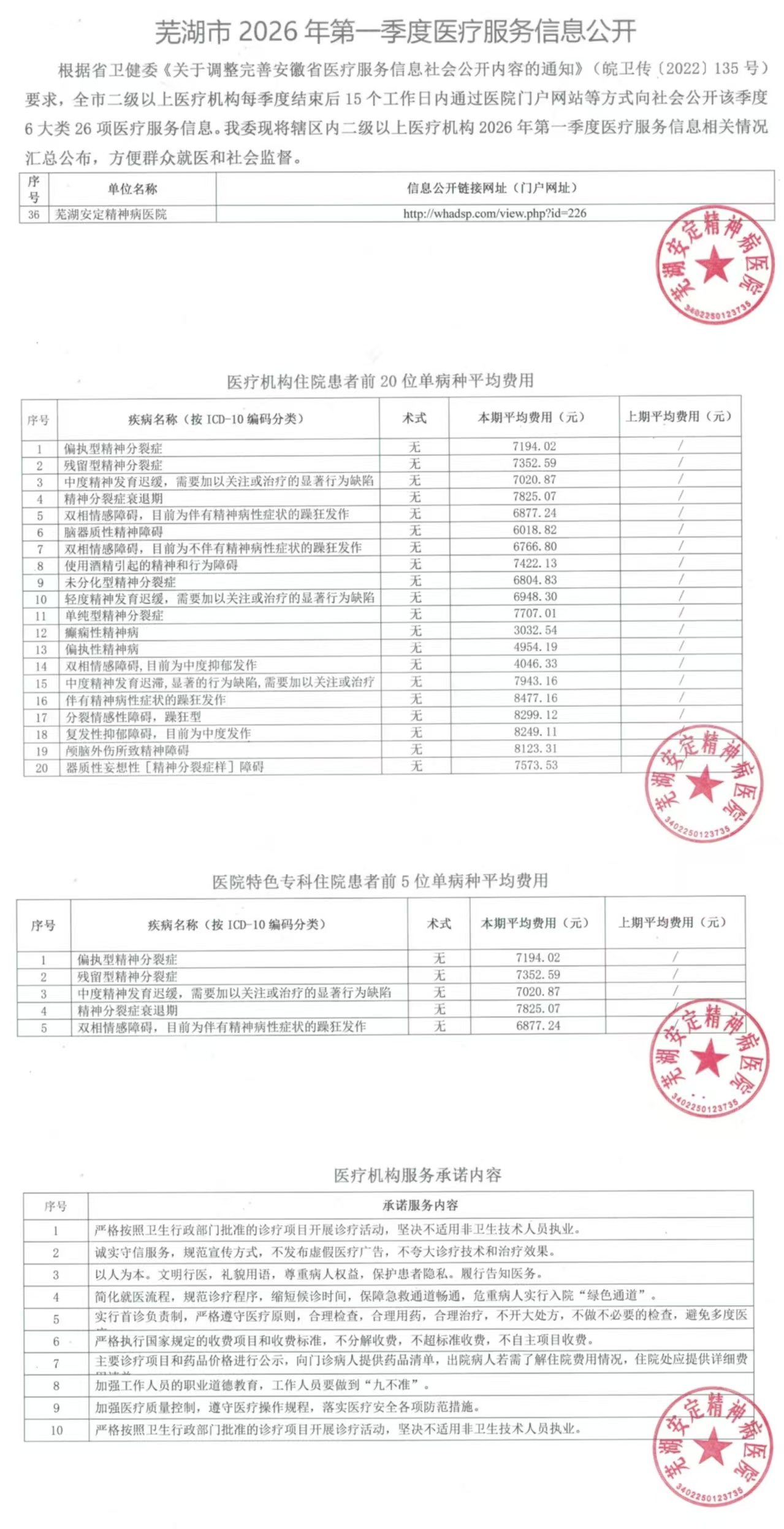 2026年芜湖安定精神病医院第一季度医疗服务信息公开